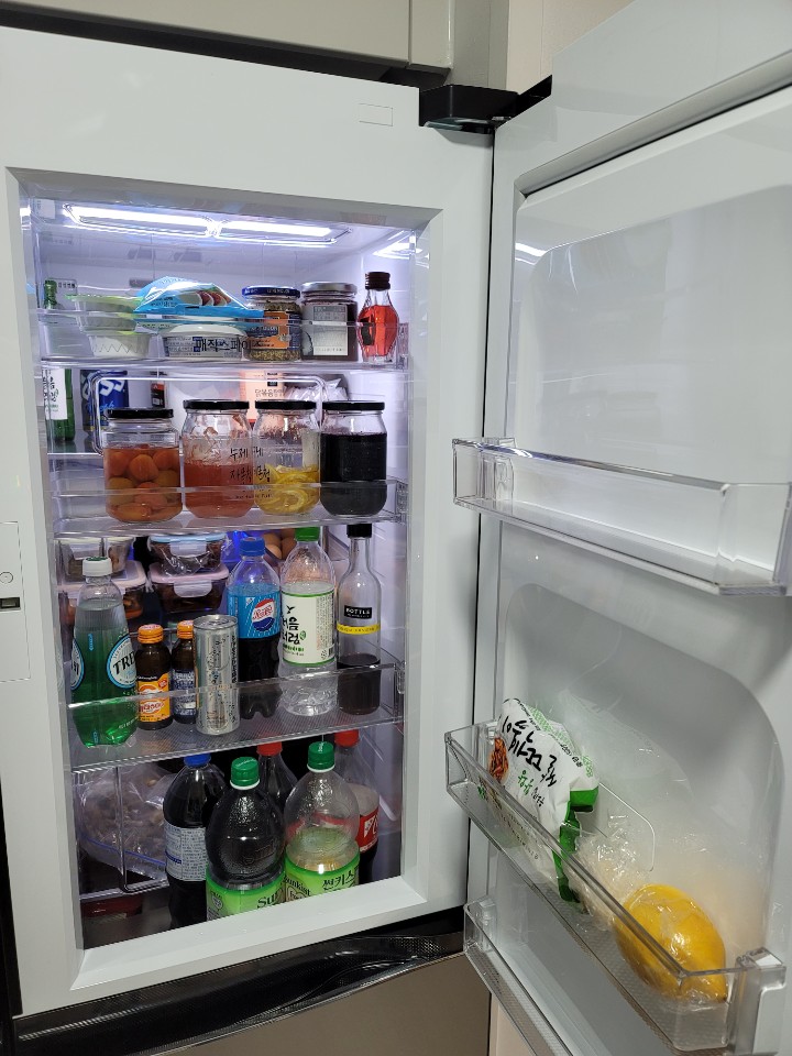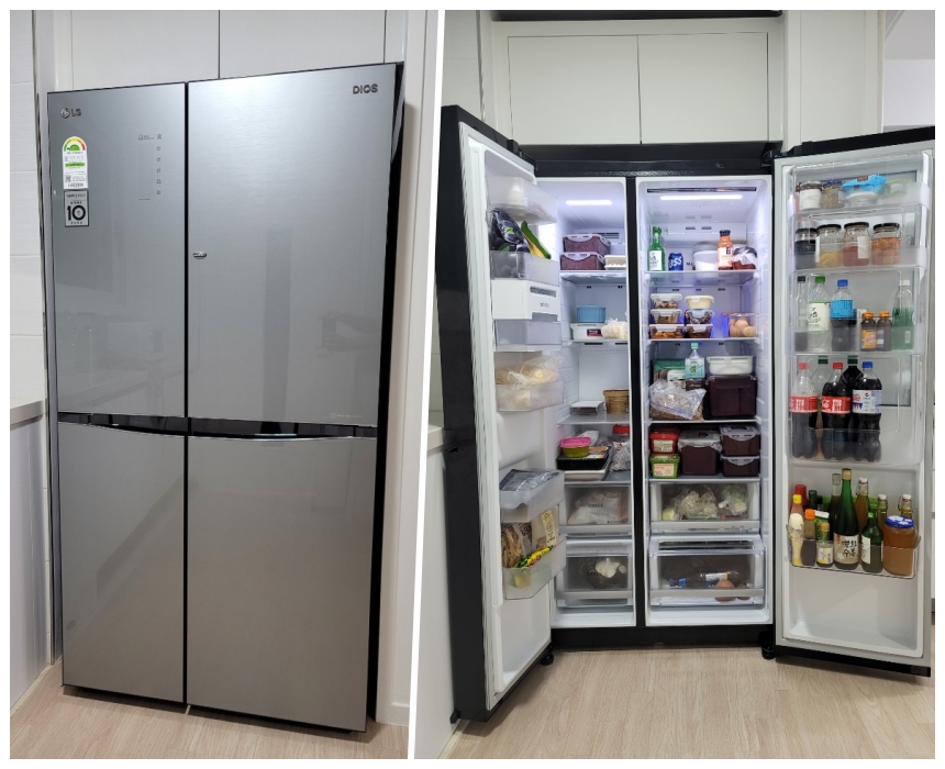 가전에 들어가는 예산의 기준치를 정해놓은 저였기 때문에 포도어 냉장고를 확 선택하기가 힘들었습니다. 눈물을 머금고 양문형 냉장고를 선택했는데 생각해보니 냉동실이든 냉장실이든 위쪽에 위치해 있으면 좋은 거 같단 생각이 들더란 말이죠^^ 그래서 양문형 냉장고도 문제가 없다고 생각했습니다.