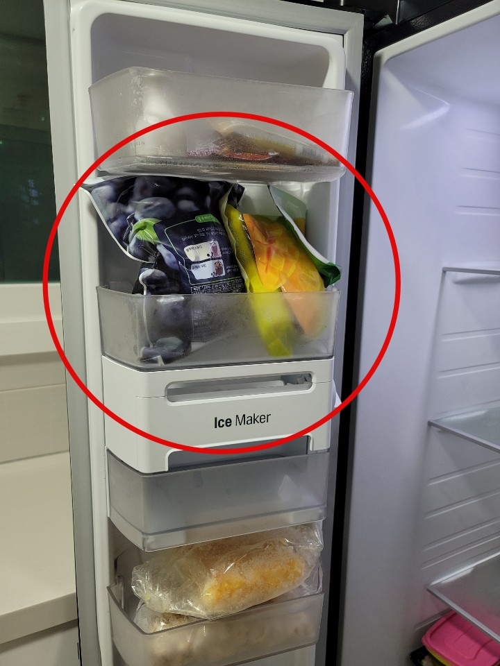 물론 미관상으로도 좋지 않지만 가장 중요한 문제는 양문형 냉장고의 경우 또는 4도어 냉장고 일지라도 하부에 위치한 냉동실 문이 완전히 열리지 않을 수 있습니다.
