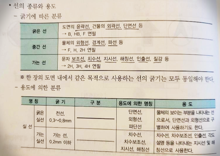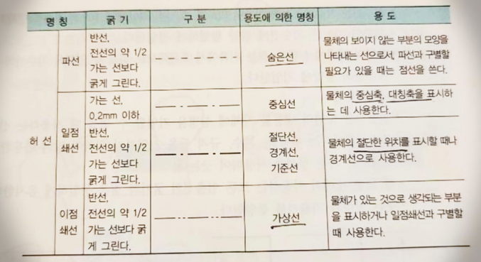 도면에서의 선의 종류와 용도에 대해서도 알아둘 필요가 있습니다.