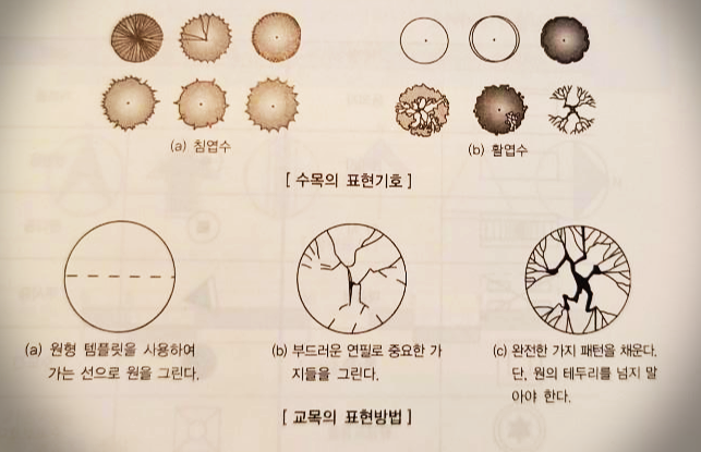 제도 기호는 수목과 시설물을 위에서 수직으로 내려다본 상태로 표시하며 실제 형태를 극히 단순화시켜 사용하고 있습니다.
