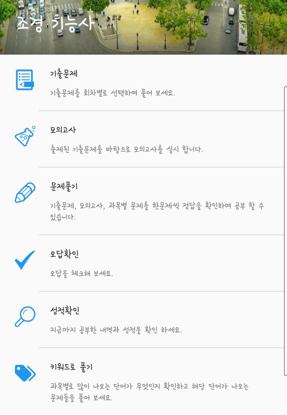 어플로 문제를 풀 수 있는 방법도 있으니 참고하시고요. 어플은 플레이스토어나 앱스토어에서 조경기능사라고 검색하시면 나옵니다.