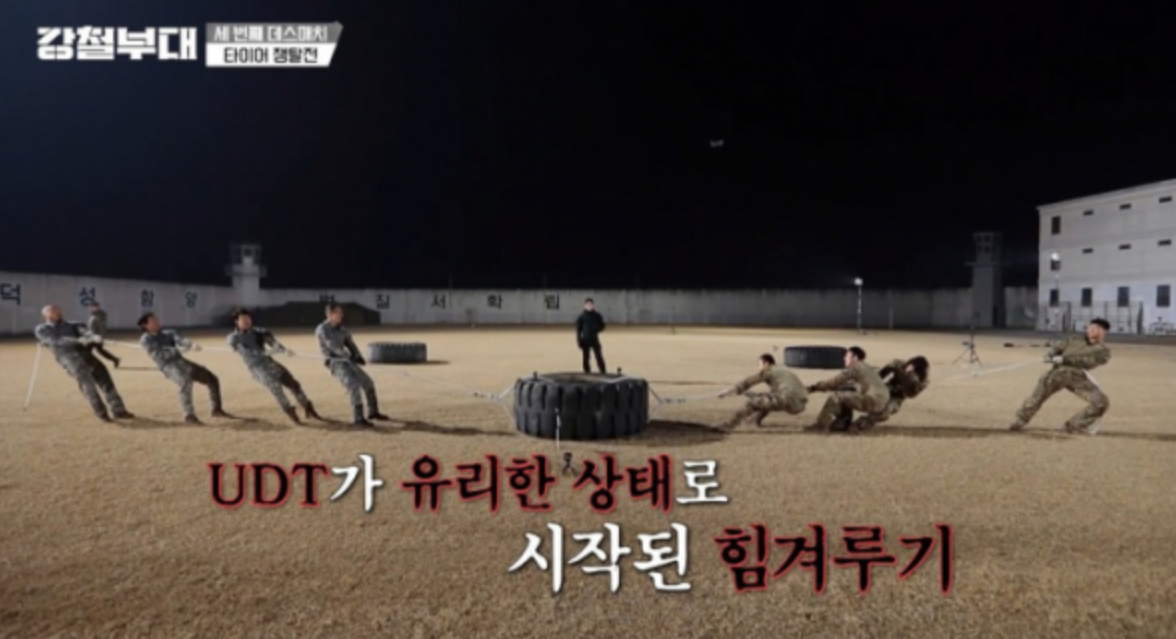 결승전은 특전사와 UDT 간의 대결로 타이어를 서로 매고 먼저 나와서 깃발을 잡는 경기를 진행했는데요.
