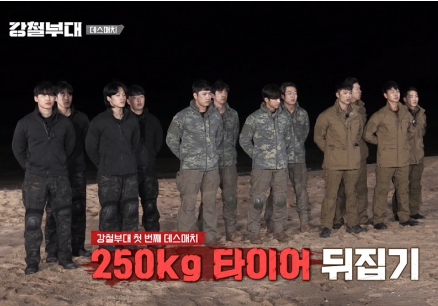 첫 데스매치 미션은 250kg의 타이어를 팀원 4명이 넘겨 300m를 이동하는 경기로 힘과 체력은 물론 강한 정신력과 팀워크가 요구됩니다.